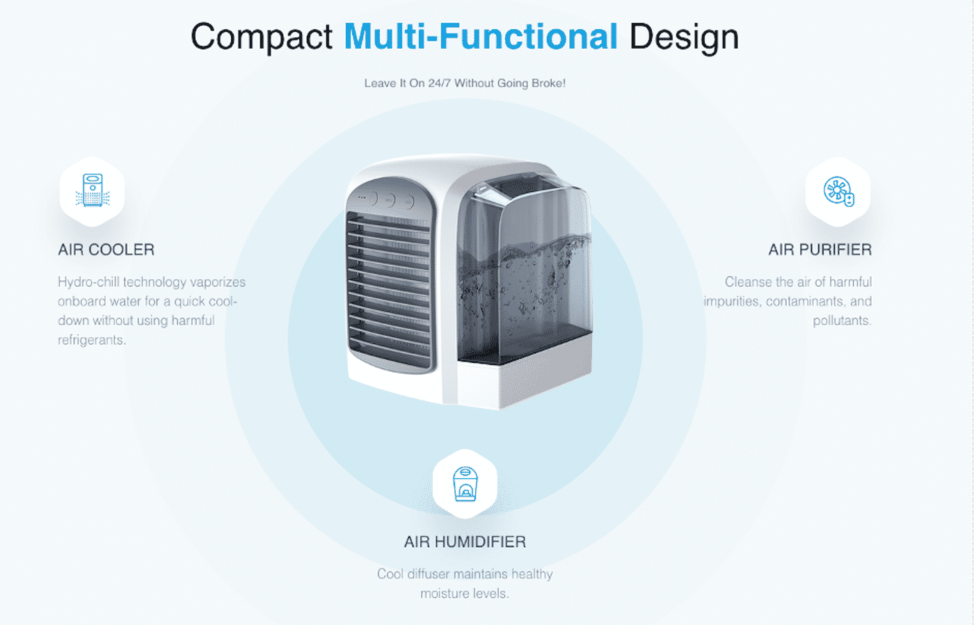 It works by using an innovative technology, known as Hydro-chill technology that vaporizes the water present in the tank to produce an instant decrease in temperature. This helps it function as an air conditioner for small spaces. It also contains a diffuser that maintains the level of moisture in a healthy range to avoid excessive drying of the skin. Through this mechanism, it works as a humidifier. This device can also work as a normal fan with adjustable fan speed.
