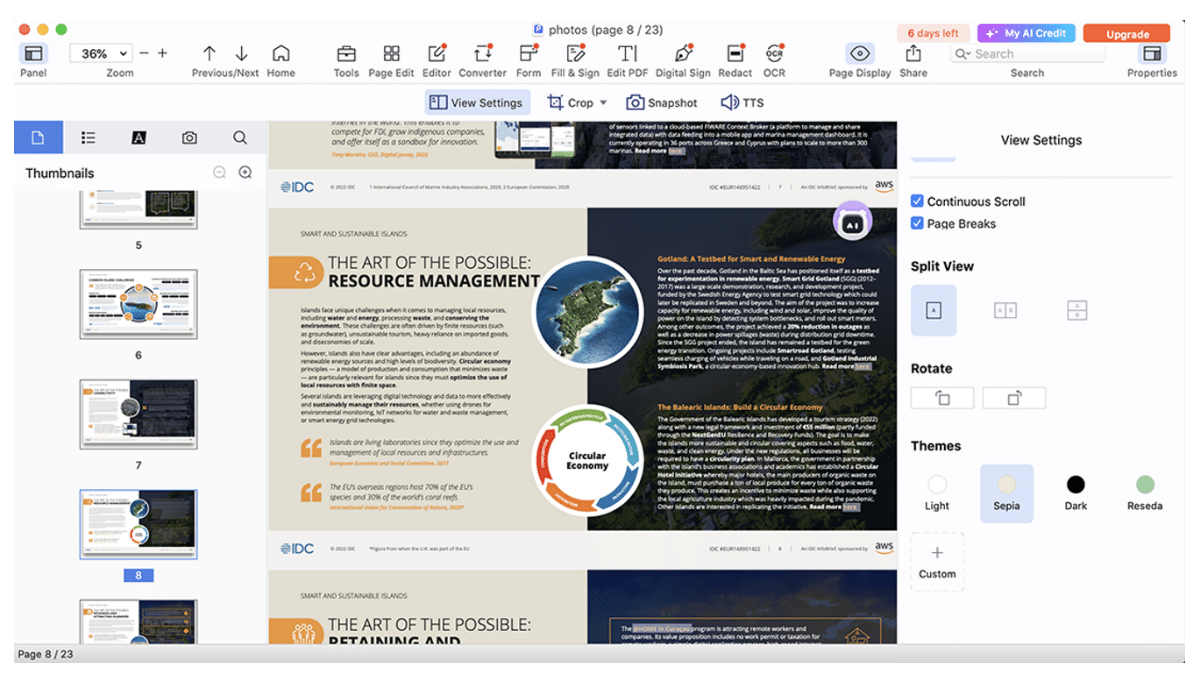 - View PDF in multiple modes: Enjoy a comfortable reading experience with versatile display modes and color themes. Navigate to a specific page or part of PDF quickly by outline, thumbnail and bookmark.