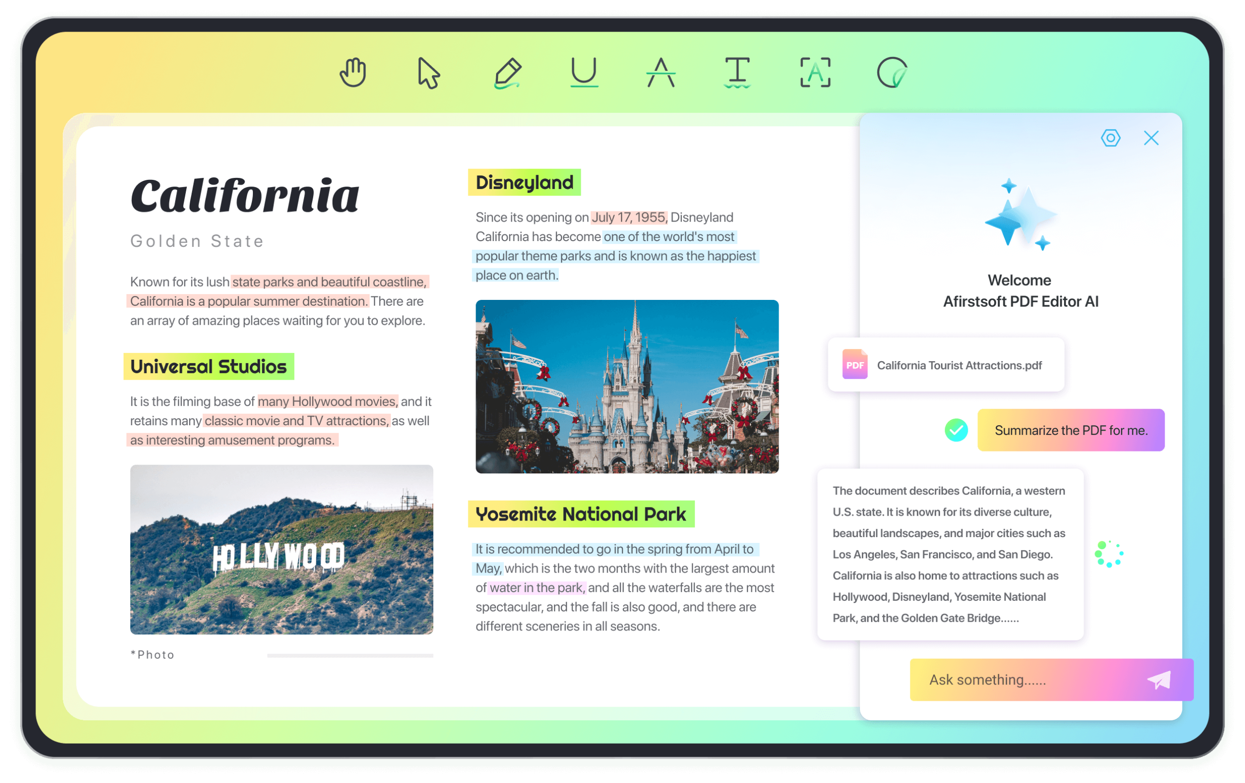 PDF editing is constantly evolving to become more straightforward and efficient. With Afirstsoft AI, you can enjoy all the benefits of AI-powered PDF editing processes. This revolutionary technology allows you to summarize PDFs and extract essential information to save you from lengthy and strenuous reading. You can also ask Afirstsoft AI any query about your PDF, which enhances your reading experience.
