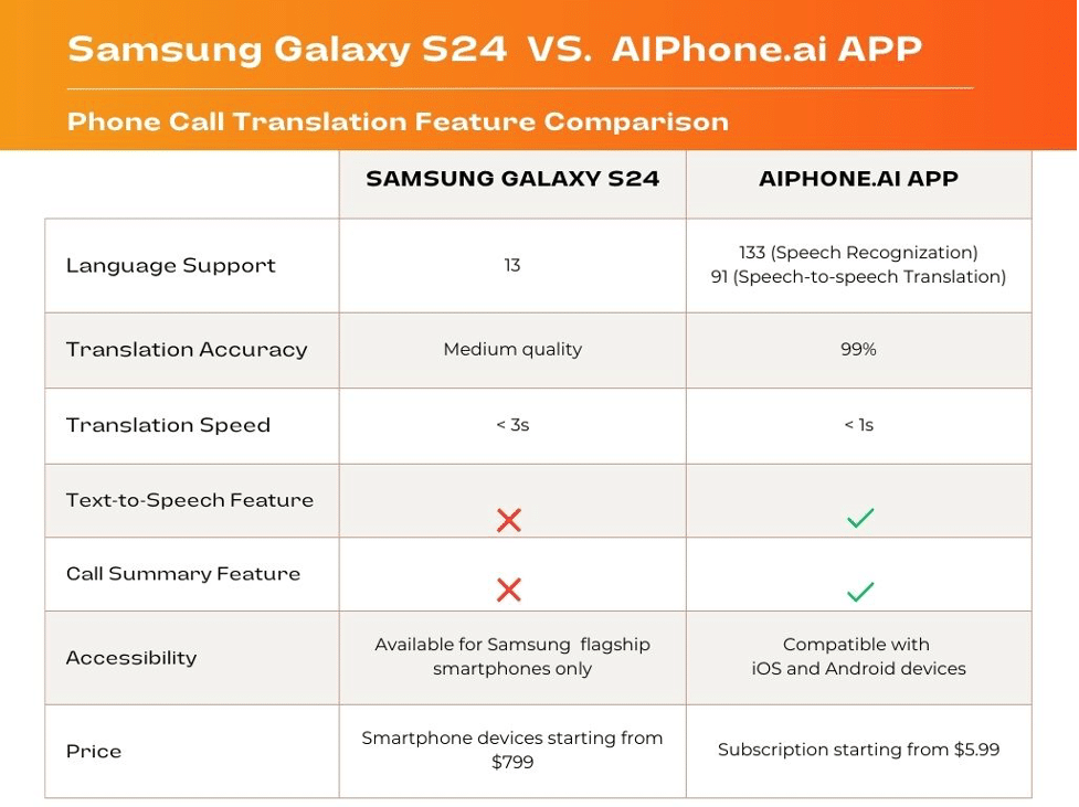 | Feature | Samsung Galaxy S24 Live Translate | AI Phone.ai App |