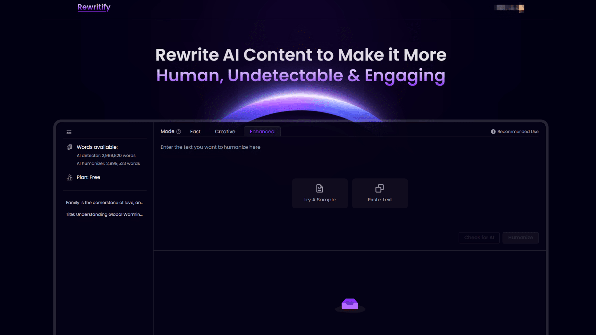First things first, Rewritify is a very powerful AI humanizer. That means it can take your AI-generated text, like blogs and articles written by Claude, Gemini, or ChatGPT, and rewrite them to make them more human.