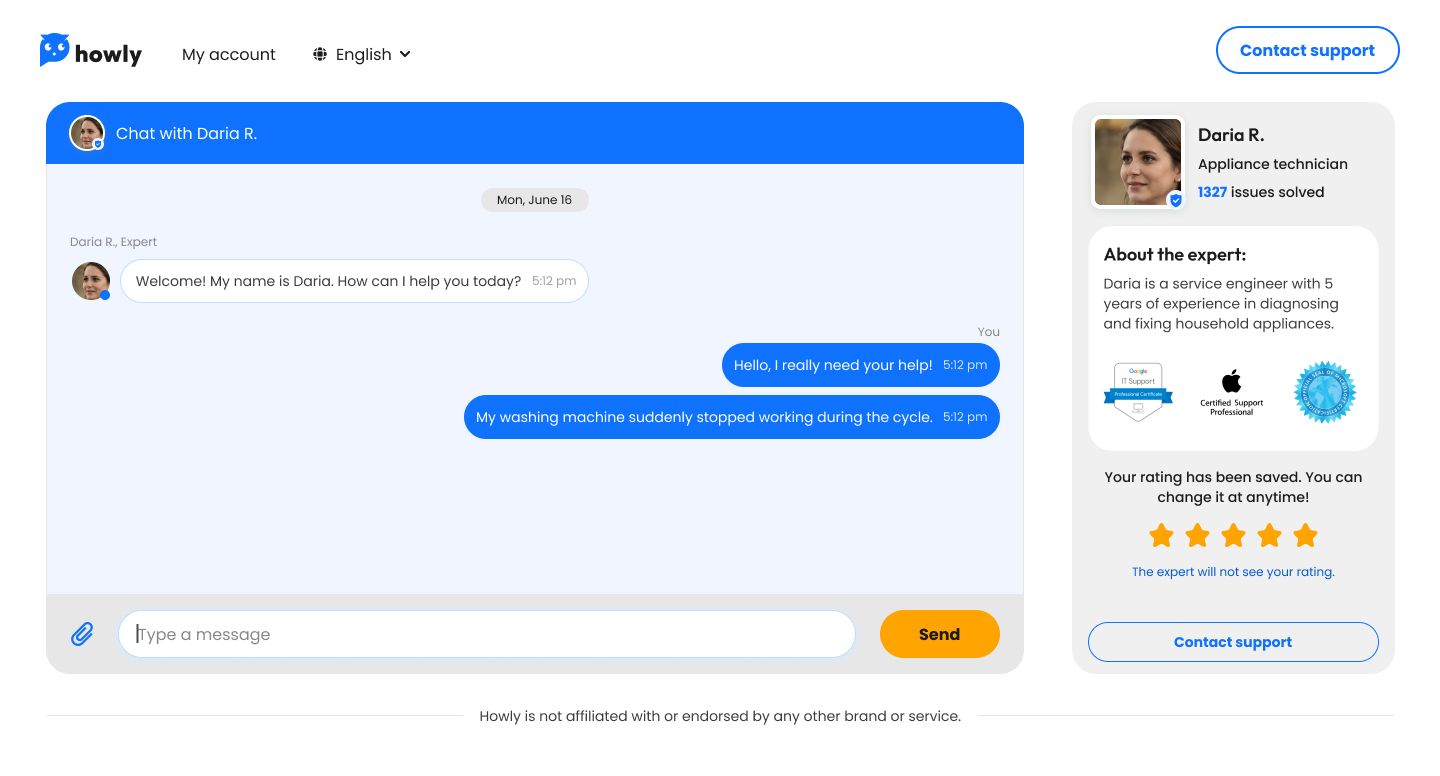 The value of Howly.com is in its capacity to connect you with a live expert who knows your washing machine’s error codes and guides you through safe solutions. To unclog a hose, reconfigure laundry, reset the door lock, or perform basic motor inspection, the expert gives step by step guidance, making it simpler to solve problems at home rather than waiting for days for a repairman.