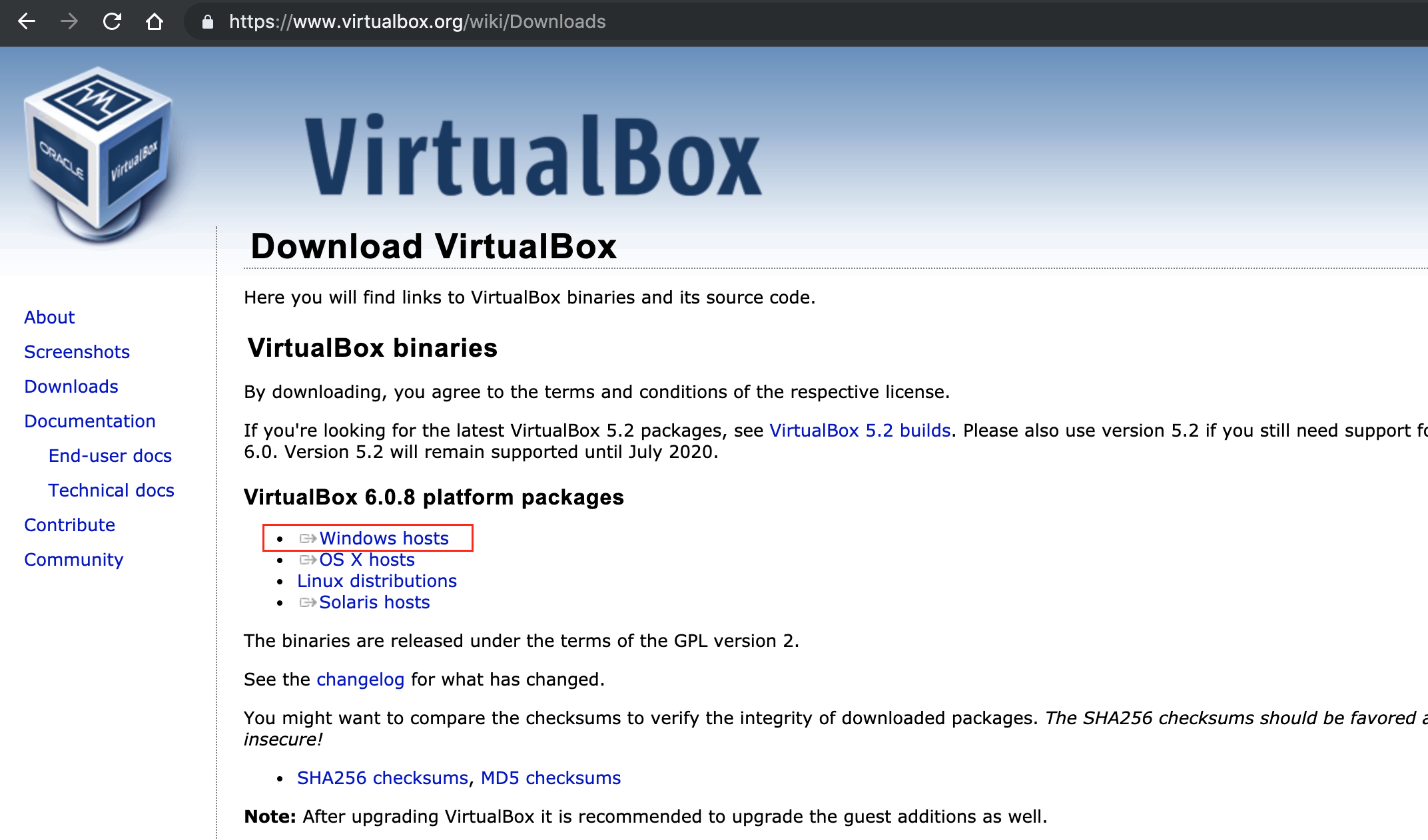 - Download the VirtualBox software on your PC by clicking the “Windows Hosts” link.