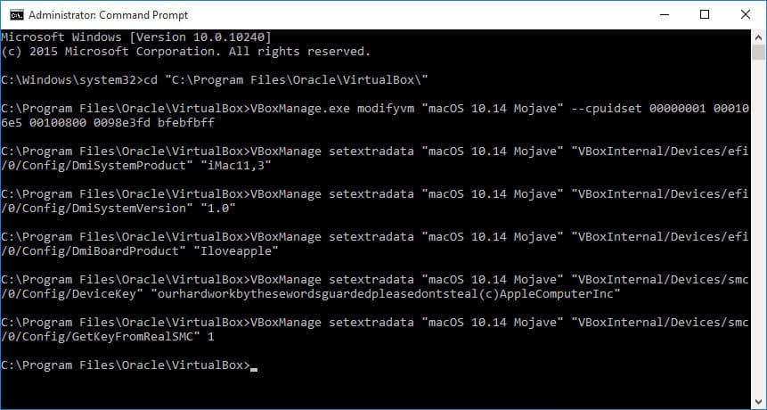 VBoxManage setextradata “Your VM Name” “VBoxInternal/Devices/smc/0/Config/DeviceKey” “ourhardworkbythesewordsguardedpleasedontsteal(c)AppleComputerInc”
