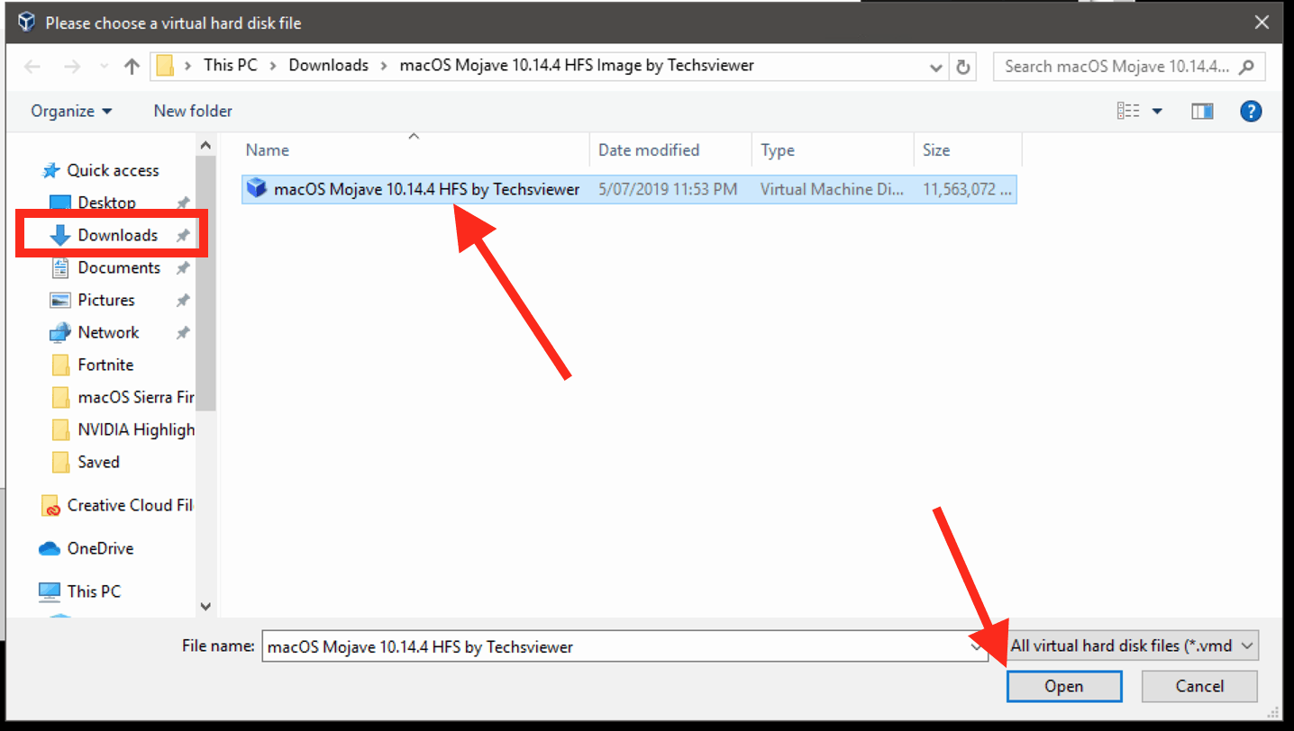 - Select the “macOS Mojave 10.14.4 HFS by Techsviewer.vmdk” file and click “Open”.