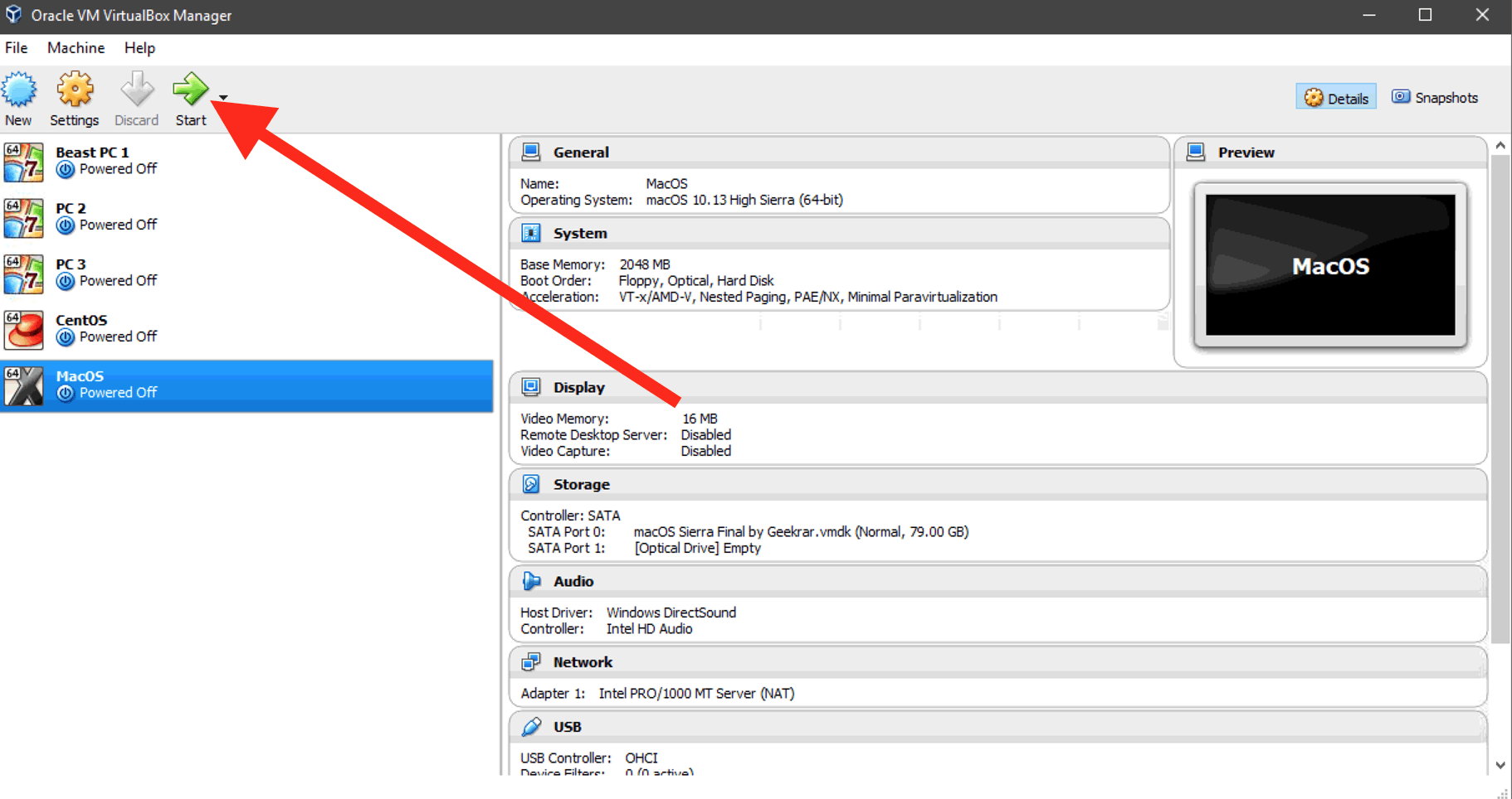 - Once the above commands have been executed in the Command Prompt, go back to the VirtualBox software, click on the “Start” button.