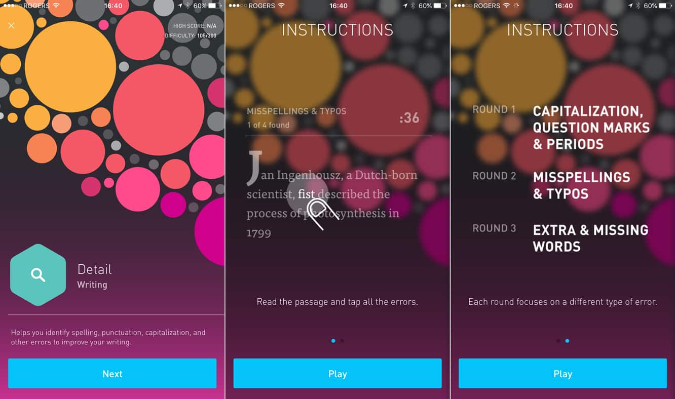 Elevate (free) — Another game designed to stimulate and train your brain, Elevate is made to help eliminate writing errors. Significant educational content has been added to Elevate games like Error Avoidance, Extraction, Spelling, and others, and a new sound setting lets you toggle game sound effects on and off.