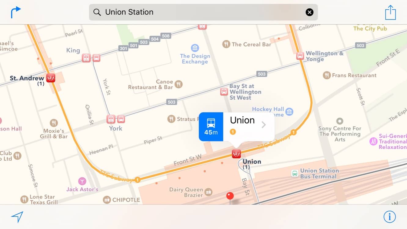 Transit stops and stations themselves are also tappable targets that can be used to display more detail about the routes available at each station and their departure times — a handy feature for determining what’s available when you’re already at or near a station. At this point, the information provided in these views is static, based on transit provider schedules rather than dynamic GPS information used by third-party apps such as Transit App, but as this is the first beta, it’s entirely possible Apple may still add this capability before the final release.