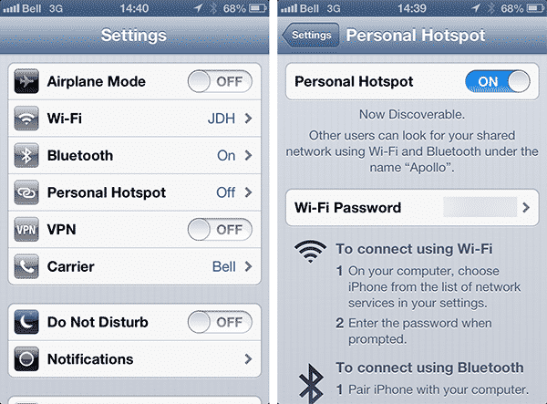 To use the feature, you simply need to go into Settings and look for Personal Hotspot; if you’ve never configured the feature before, it may initially be hidden under General, Network, but once you’ve enabled it at least once it should appear on the main Settings screen, as shown above.