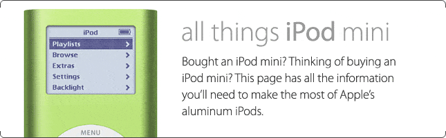 iPod mini Power Users’ Review (iLounge rating: B+): The definitive review of Apple’s iPod mini, from packaging to marketing. Learn why users with greater demands may prefer other, more expensive iPods to the iPod mini.