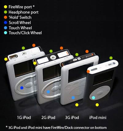Which iPod do I have? First- and second-generation iPods included FireWire ports on their tops, unlike any other iPod. Third-generation iPods had circular “Scroll Wheel” controls with a row of four buttons on top that did not appear on any other iPod model. The picture below will help you identify whether you’re covered.
