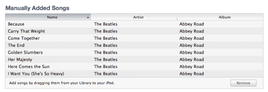 Note that iTunes 10 added the ability to drag-and-drop most content types directly to an iPod, iPhone or iPad even if you’re using automatic synchronization for that content. For manually added music, a separate Manually Added Songs section will appear at the bottom of the Music settings screen for your device, showing a list of songs that have been manually added and an option to remove individual items from there.