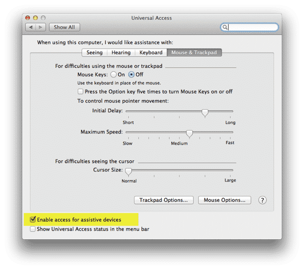 Unfortunately, none of the photo sharing features in iTunes are exposed directly to AppleScript, so we’re forced to resort to manipulating iTunes controls directly. To allow AppleScript to do this on your behalf, it is first necessary to go into your OS X System Preferences application and select the Enable access for assistive devices option under your Universal Access settings.