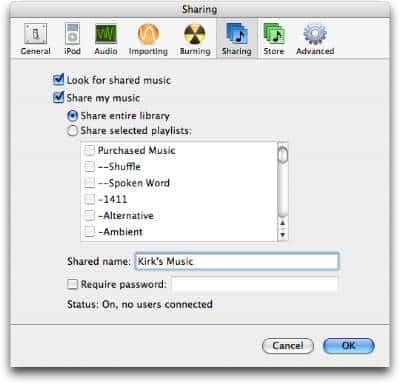 iTunes includes everything you need to share your music and to connect to other iTunes music libraries. You don’t need any additional software, but you do need to be connected to a network – either wired or wireless. By default, music sharing is not turned on, so you must go to iTunes’ preferences and set up sharing.