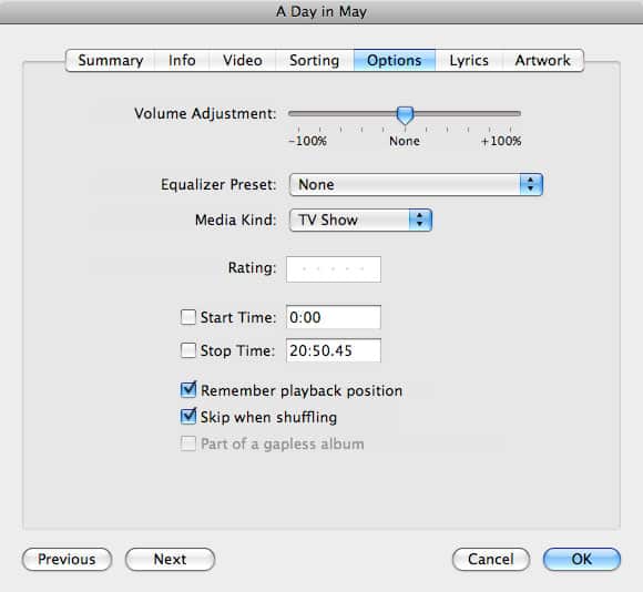 As an added bonus, iTunes 8 now also allows you to change the Media Kind for videos purchased from the iTunes Store, and you can now tag more than one video file at a time—simply select them all in iTunes before choosing Get Info and you will note that most tabs remain available in the multiple file information dialog boxes. Be sure to check out our newly-revised Complete Guide to Managing iTunes Videos for more information.