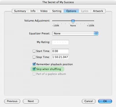 When this option is enabled for a given track, the iPod will never play that track next in sequence when the “Shuffle” setting is enabled on the iPod (which can be found in the iPod’s Settings menu).