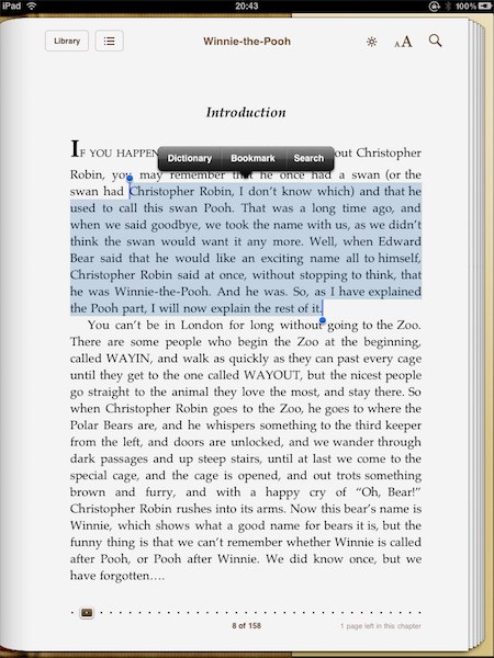 With unprotected ePub files you’ve imported yourself, on the other hand, the same options appear, but you’ll see a “Copy” option is also available to transfer the selected text to the iPad clipboard.