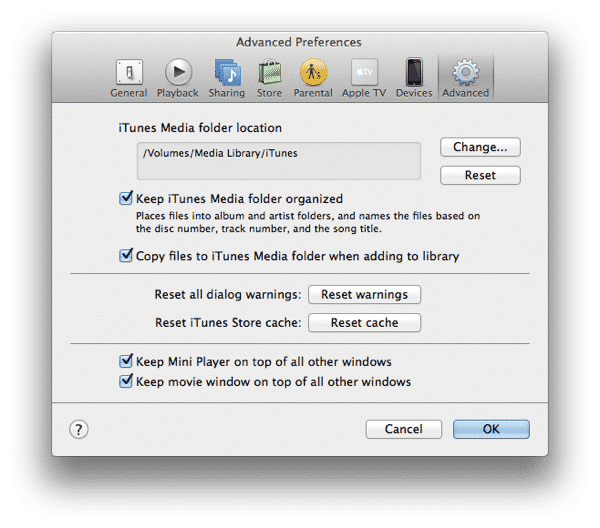A: There are two ways that you can approach this depending on whether you want iTunes to manage your music library for you or not. The settings you need to tweak here can be found in your iTunes Preferences, on the Advanced tab: