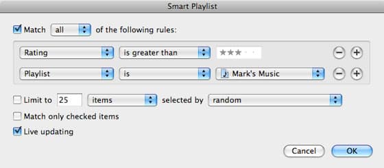 A: You can accomplish what you’re looking for simply through the use of some more advanced Smart Playlist features. Playlists like “My Top Rated” are Smart Playlists which select tracks based on search conditions that you specify in the Smart Playlist settings.