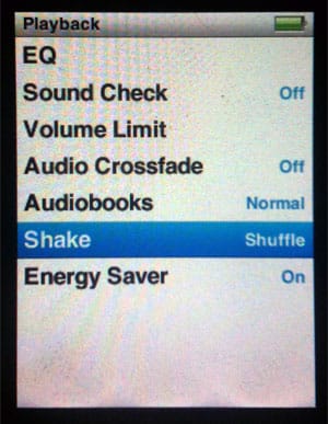 Within this section should be a setting labelled Shake. Simply select this and tap the center select button on your iPod to toggle this setting from “Shuffle” to “Off.”