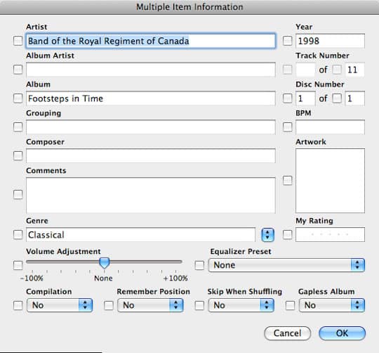 From this dialog box, edit the common track information like you normally would (ie, album, artist, etc) and click “OK” to apply these changes to all of the selected CD tracks.