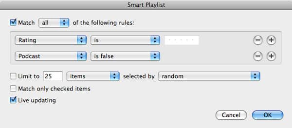 Add a new criteria line, and enter “Podcast is false” to include only those tracks which are not podcasts. An Unrated Tracks Smart Playlist which excludes podcasts might look something like the following:
