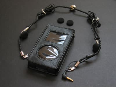 This black leather iPod case is part of a family that describes itself as “the only iPod case & iLanyard with built-in earbuds.” Silver lobster claw hooks attach the lanyard to the case.