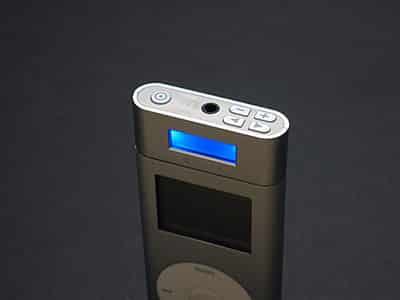 It’s also substantially smaller than Griffin’s iFM and BTI’s TuneStir FM radio attachments, and does not dangle from a cord, either. Instead, its body fits right on top of the iPod mini, adding less than an inch of extra height while incorporating a nice blue FM tuning screen.