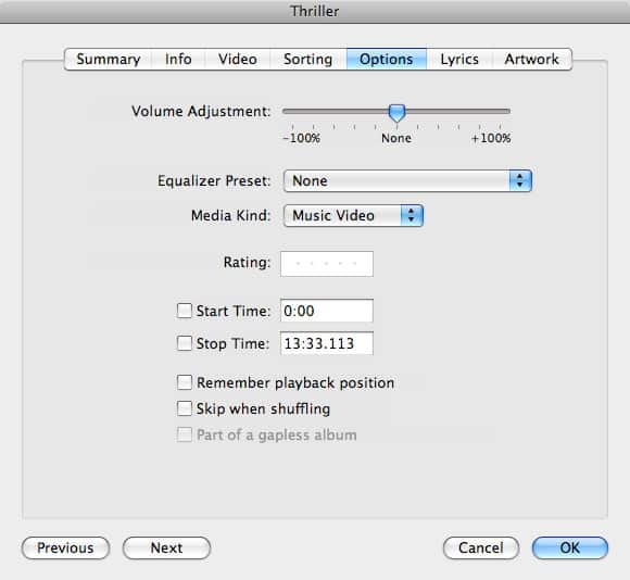 Every video file you import into iTunes begins as a “Movie” by default, and will therefore be listed under the “Movies” section and treated as a movie track. To change this, you need to edit the information within these tracks and change their “Media Kind” to something else, such as “Music Video.” This is accomplished by selecting the track(s) in question, choosing File, Get Info from the iTunes menu to bring up the track information dialog box and then choosing the “Options” tab.