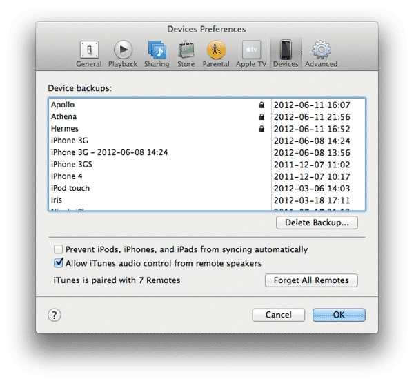 You can select any backup from here and click the Delete Backup button to remove it; note that backups are not actually removed until you subsequently click the OK button, so if you make a mistake here you can back out by clicking Cancel, instead. You can identify specific backups by hovering over them with the mouse pointer, which will show a tooltip overlay with the serial number of the device that the backup is from—a useful feature if you have two or more backups with the same name and similar time stamps and are uncertain which one to delete. Backups from cellular capable devices will also display IMEI information here, and iPhone backups will show the cellular phone number.