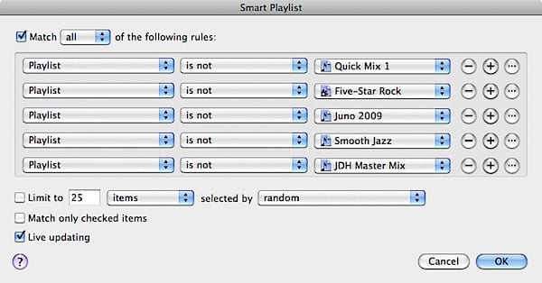 As you can imagine, this could get cumbersome if you have a lot of playlists, but one useful trick here is that you can use a playlist folder as criteria in the Smart Playlist. So, if you were to organize all of your playlists into a single folder called “My Playlists” you could simply specify a criteria of Playlist is not “My Playlists”.