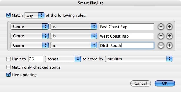 Q: Is it possible to create a genre style playlist with multiple genres? Say I want one that has East Coast Rap, West Coast Rap, and Dirth South. I can’t do “Genre contains ‘Rap’”, because Dirth South genre doesn’t include the word “Rap.” This is just a more simplified version of what I am really trying to do, but I can’t even make this work.