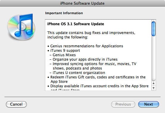 The iPhone 3.1 update lists a number of new features, including Genius support for the App Store, iTunes 9 support, the ability to use the Voice Control feature over Bluetooth on the iPhone 3GS, non-destructive video trimming, accessibility improvements and more.