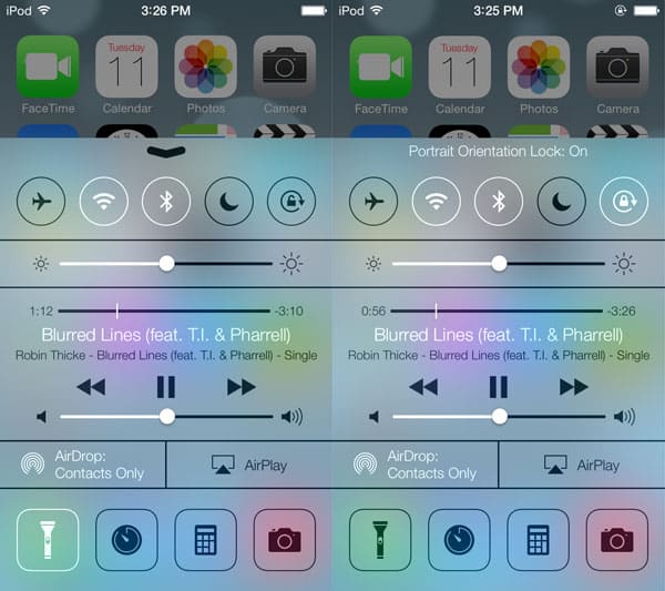 Control Center is one of iOS 7’s biggest new features, and it’s something users have wanted for years. From anywhere within the system, you can now swipe up to reveal this new control panel, which rises as a translucent pane from the bottom of the screen in either landscape or portrait orientation. Control Center is designed to provide quick access to a number of useful settings, many of which were previously only available by diving into the Settings app. Across the top, there are buttons that toggle Airplane Mode, Wi-Fi, Bluetooth, Do Not Disturb, and Portrait Orientation Lock on and off. Directly beneath that are a brightness slider and a mini player for audio content. An AirDrop wireless sharing settings menu is located next to an AirPlay receiver toggle, and finally, quick access is provided to four different apps along the bottom row. The first is a flashlight feature to activate the rear LED lights on certain iPod touch and iPhone models—the first time Apple has built such functionality into iOS. Clock, calculator, and camera icons each take you directly to those respective apps.