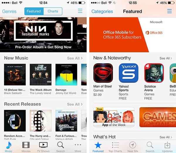 The iTunes Store and App Store apps get the standard iOS 7 facelift for their UI elements but remain much the same otherwise since most of the actual store screens and menus are delivered from Apple’s servers rather than built into iOS.