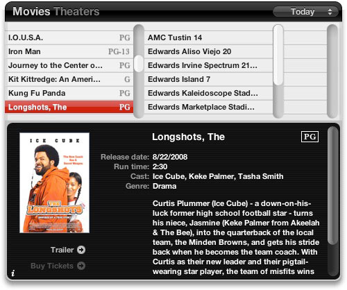 With the releases of Apple’s Dashboard and Yahoo!‘s Konfabulator/Widgets programs, Macs and PCs gained the ability to run miniature applications called “widgets” that could quickly check the Internet for weather, flight information, stock prices and more. Notably, Apple developed a Movies widget for Mac OS X Leopard, capable of displaying movie and theater details, quick links to trailers and summary text, and even offering the ability to buy tickets directly from the widget. Though the iPhone received custom versions of some of the best Apple-developed widgets, it somehow never wound up with an official “Movies” program.