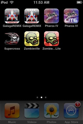 This week’s games are the 2-D and 3-D space shooters Galaga Remix and Pharos IV: Assault, the motocross racing game 2XL Supercross, and the 2-D zombie-blasting game Zombieville USA. Three of the games are available in Lite versions for those who are interested in trying the titles before buying them. Read on for all the details.