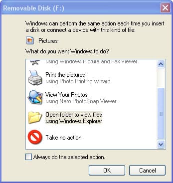 If this is the first time that a particular removable disk has been connected, you should normally receive a list of options, as shown above. However, if you have previously selected an option, such as opening Windows Explorer to view the files on the device, Windows will remember that setting the next time you connect that device and simply perform that operation without prompting you again.