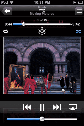 The button near the top-right corner controls shuffle mode and will appear in blue when shuffle is enabled, or white when shuffle is disabled. Similarly, the button near the top-left corner is used to set repeat mode and toggles between repeat off (white), repeat single track (blue with a small 1 overlaid), and repeat all tracks in the playlist (blue). If the shuffle button is blue, simply tap on it once and it should turn white and disable shuffle mode, at which point your tracks should play in the order in which they’re listed in the playlist.