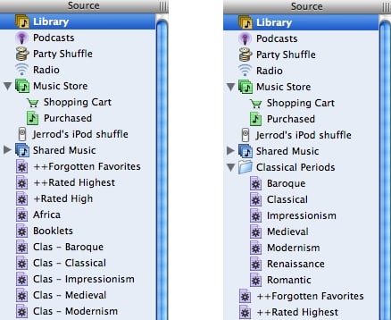 Tip: If you select the playlist folder in iTunes’ Source column, the Library window will contain the contents of all playlists inside that folder.