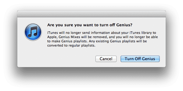 The cleanest way to do this, however, is to turn OFF the Genius feature manually by going to the Store menu and selecting Turn Off Genius. You’ll be shown a dialog explaining the process of turning off the Genius feature and asking for confirmation.