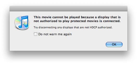 Also note that HDCP isn’t required for all HD videos. High-definition TV shows purchased through the iTunes Store will generally play back on both a computer and an external monitor without a fuss—a reason that users most likely haven’t come across this error message up until now.