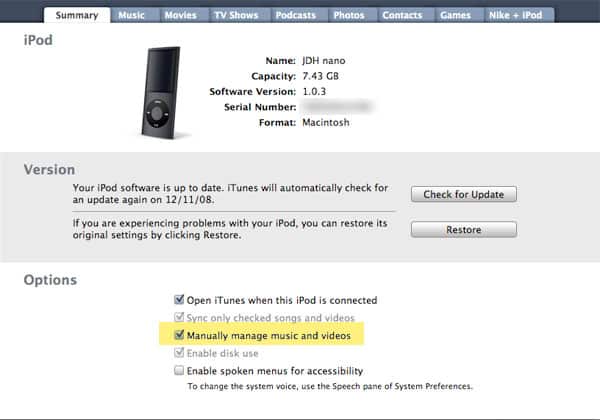 Alternatively, if you would simply like to return to automatic synchronization, where your iPod nano does mirror the content of your iTunes library, simply UNcheck the box to Manually manage music and videos in your device’s summary tab as shown above, and then click “Apply” and your iPod will sync with your iTunes library.