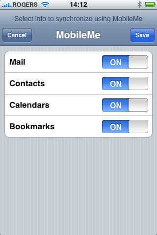 Once you have entered your MobileMe account information and it has been validated, the next screen allows you to select which content you would like to sync to your iPhone: