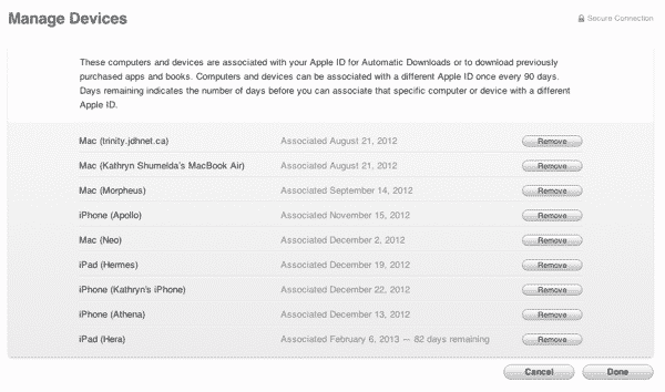 A: Actually, the limit of five devices per iTunes Store account only applies to authorizations for computers using iTunes. Apple actually allows you to have up to ten devices authorized in total for features such as iTunes Match and re-downloading previous purchases from iTunes in the Cloud, up to five of which can be computers running iTunes. So in other words, you could have anywhere from 10 iOS devices and no computers up to five computers and five iOS devices or any combination in between. You can view the number of devices that have been authorized for these features by going into your iTunes Store account information from within iTunes and choosing the Manage Devices option.