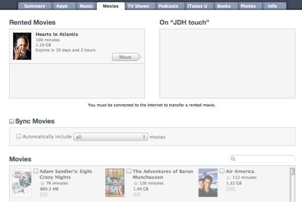 A: If you are using iTunes 9 and a recent-model iPod touch there should actually not be a “Videos” tab in iTunes but instead separate tabs for “Movies” and “TV Shows.” Options for transferring Rented Movies normally appear under the “Movies” tab as one would expect. Assuming that you purchased a brand-new, current model iPod touch it’s likely that you’re already running a semi-recent firmware version, but it’s worth noting that old v1.x versions of the iPod touch firmware did not provide support for Movie Rentals; this was added in the v1.1.3 update in January 2008. If you’ve purchased an older, used iPod touch model this is something worth considering.