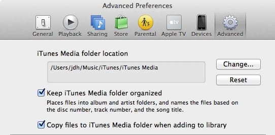 The first option, “iTunes Media folder location” indicates where your iTunes media content is stored by default. Remember that this only includes the media content and not the library database itself. Whether all of your content is located in this folder is going to depend upon the next two settings found on this screen: