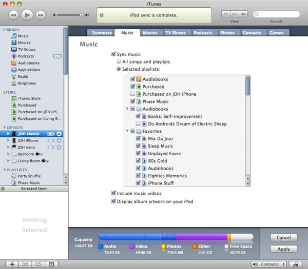 If this is not what you desire, however, you can easily select “All Songs and Playlists” and click the “Apply” button to simply tell iTunes to transfer everything in your iTunes library (including all playlists) onto your iPod. Note that if you do not have sufficient space on your iPod to store your entire iTunes library, iTunes will give you an error message advising you of this and offering to help free up space on your iPod by removing certain types of content such as podcasts or photos.