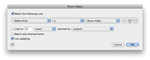 As a playlist, this will appear down in the Playlists section of your iTunes source list, but will otherwise serve the same purpose. To create a new Smart Playlist, simply choose New Smart Playlist from the File menu in iTunes. The following simple criteria will display only your Music Videos in the resulting playlist.
