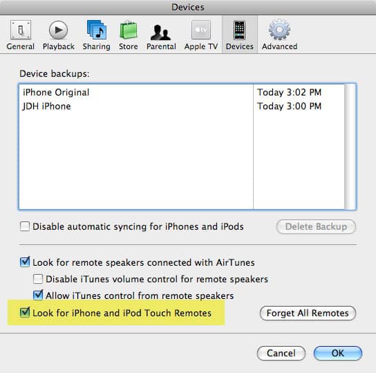 Ensure that the option “Look for iPhone and iPod touch remotes” is selected and click OK.